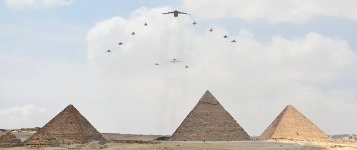 كما جرى «التدريب على التزود بالوقود في الجو، ونفَّذت مجموعة من المقاتلات المشاركة بالتدريب تشكيلاً جوياً فوق أهرامات الجيزة أبرز الدقة والكفاءة التي يتمتع بها الطيارون من كلا الجانبين»، بحسب البيان.