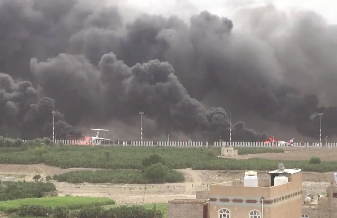 طائرة «إيرباص» تابعة للخطوط الجوية اليمنية مشتعلة على أثر غارات جوية إسرائيلية على مطار صنعاء (إ.ب.أ)