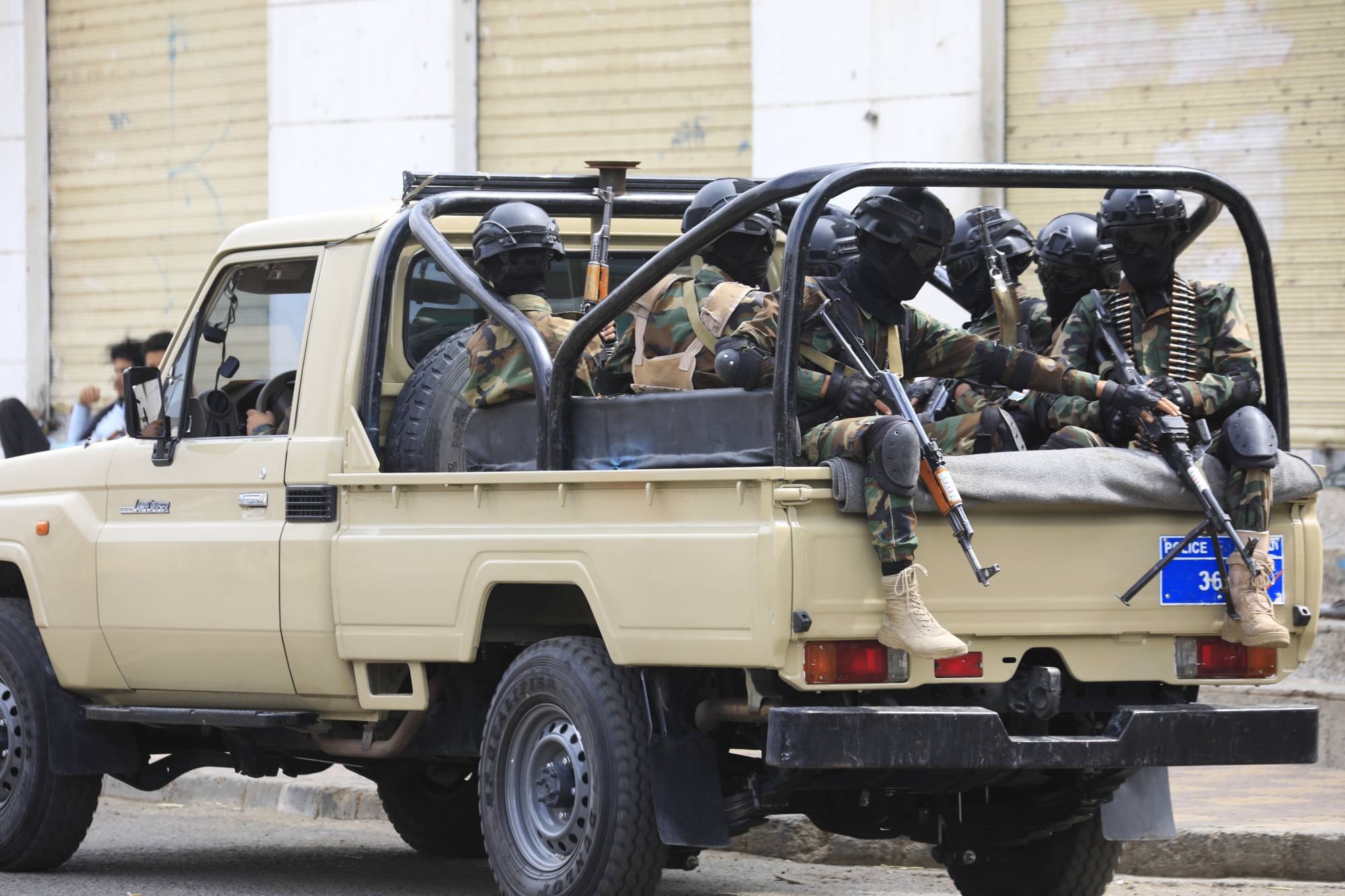 جنود حوثيون يستقلون شاحنة صغيرة أثناء دورية وسط توترات مع إسرائيل في صنعاء (إ.ب.أ)