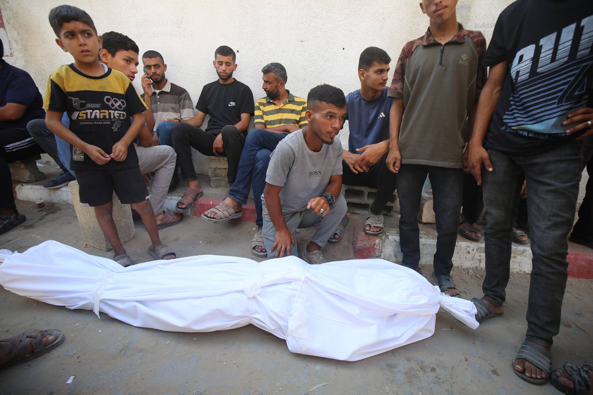 فلسطينيون يجلسون بجانب جثة قُتلت في أثناء تجمع لتلقي المساعدات في غزة (إ.ب.أ)
