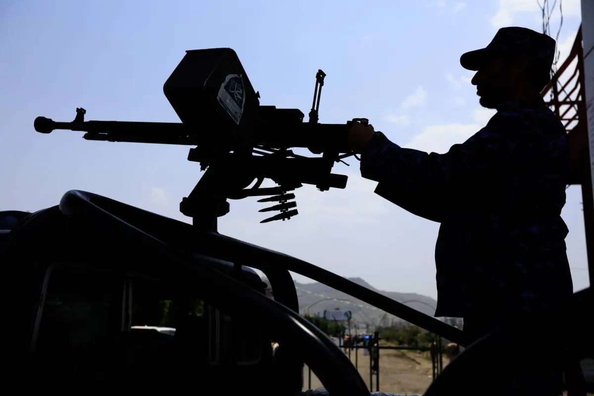 مسلح «حوثي» يظهر خلف مدفع رشاش على شاحنة صغيرة في أثناء دورية بصنعاء (إ.ب.أ)