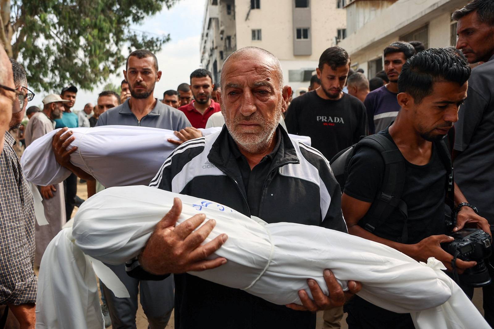 فلسطينيون يحملون جثث أطفالٍ مُكفنين قُتلوا في غارات إسرائيلية على مدينة غزة (أ ف ب)
