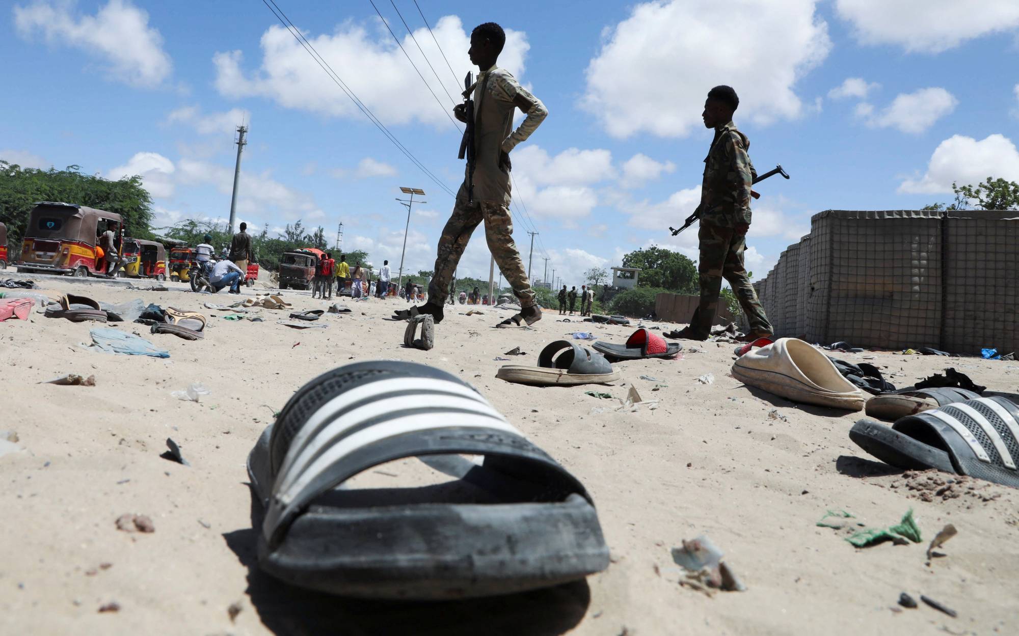ضباط عسكريون صوماليون يمرون أمام أحذية مهجورة بموقع انفجار استهدف طابوراً من المجنّدين الشباب المسجلين بقاعدة دامانيو العسكرية بمنطقة هودان بمقديشو 18 مايو 2025 (رويترز)