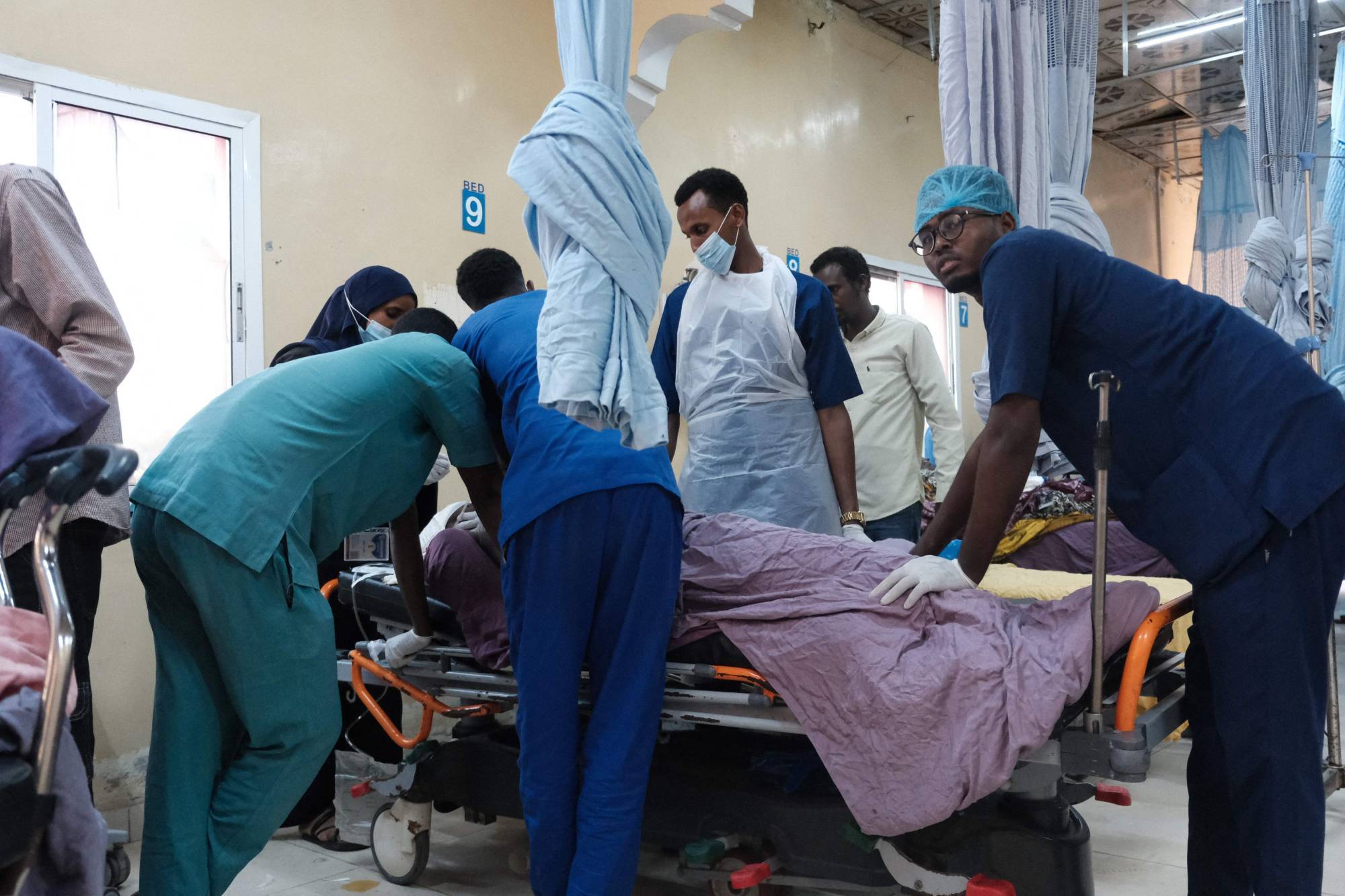 أطباء وممرضون يعالجون شاباً مصاباً بالمستشفى الصومالي السوداني بمقديشو 18 مايو 2025 إذ قُتل أشخاص عدة وجُرح آخرون عندما استهدف انتحاري يُعتقد أنه من «حركة الشباب» مركزاً للتجنيد (إ.ب.أ)