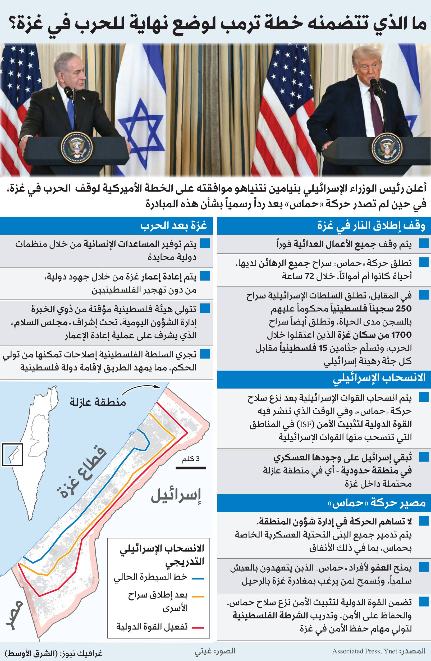 وطرح ترمب خطته لإنهاء الحرب في غزة، وتضمنت بنوداً عدة؛ أبرزها الانسحاب التدريجي للجيش الإسرائيلي من غزة، وتفكيك سلاح حركة «حماس»، ووافق رئيس الوزراء الإسرائيلي بنيامين نتنياهو على بنودها.