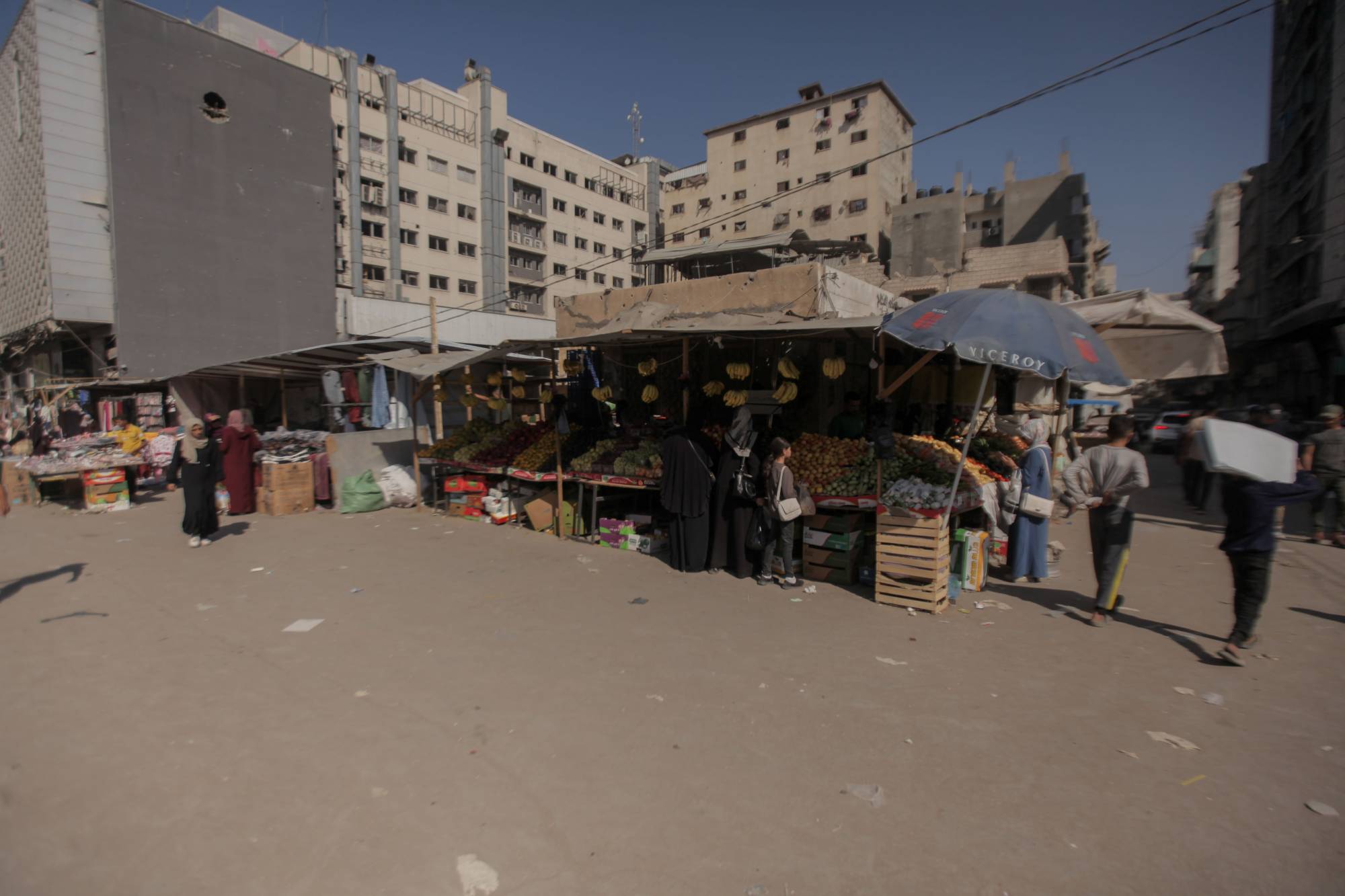 فلسطينيون يتجولون في سوق غزة بعد عامين من الحرب الإسرائيلية والدمار والتجويع (د.ب.أ)
