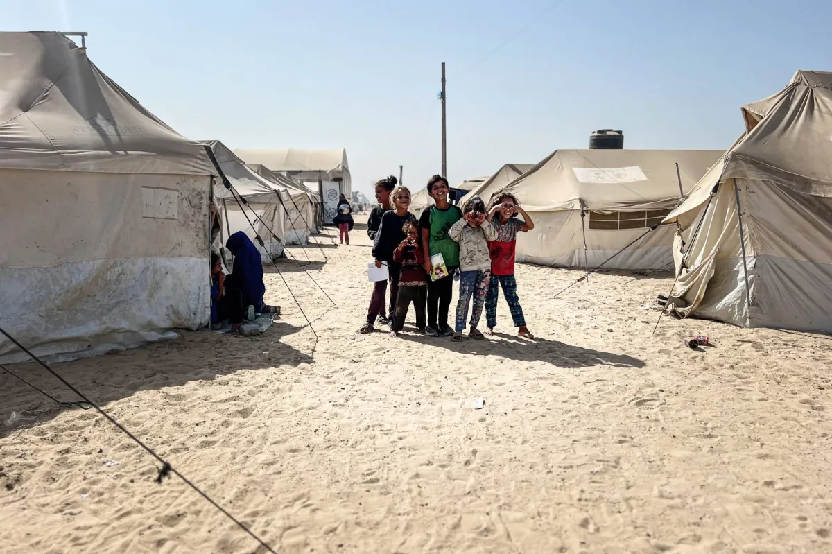 أطفال فلسطينيون بينهم يتامى في مخيم البريج للنازحين بوسط قطاع غزة (د.ب.أ)