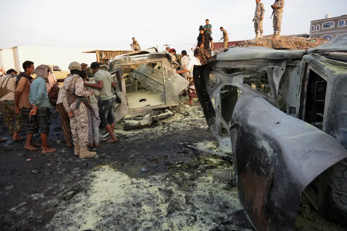 أشخاص وأفراد من قوات الأمن يتجمعون في موقع هجوم مميت بسيارة مفخخة بالقرب من مدينة عدن (رويترز)
