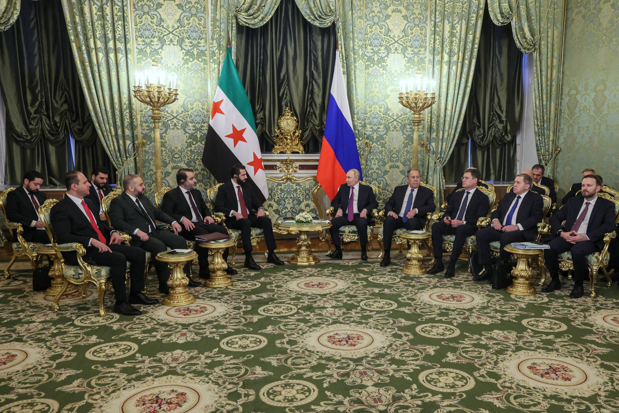 الوفدان الروسي والسوري خلال استقبال الرئيس أحمد الشرع في الكرملين (أ.ب)