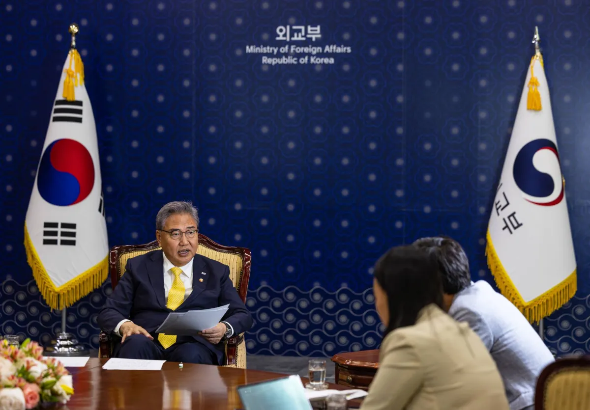 وزير الخارجية الكوري الجنوبي بارك جين يتحدث للصحافة في سيول (د.ب.أ)