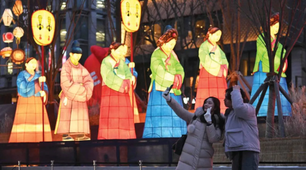فتاتان تلتقطان صورة تذكارية وسط العاصمة الكورية الجنوبية سيول (أ.ف.ب)