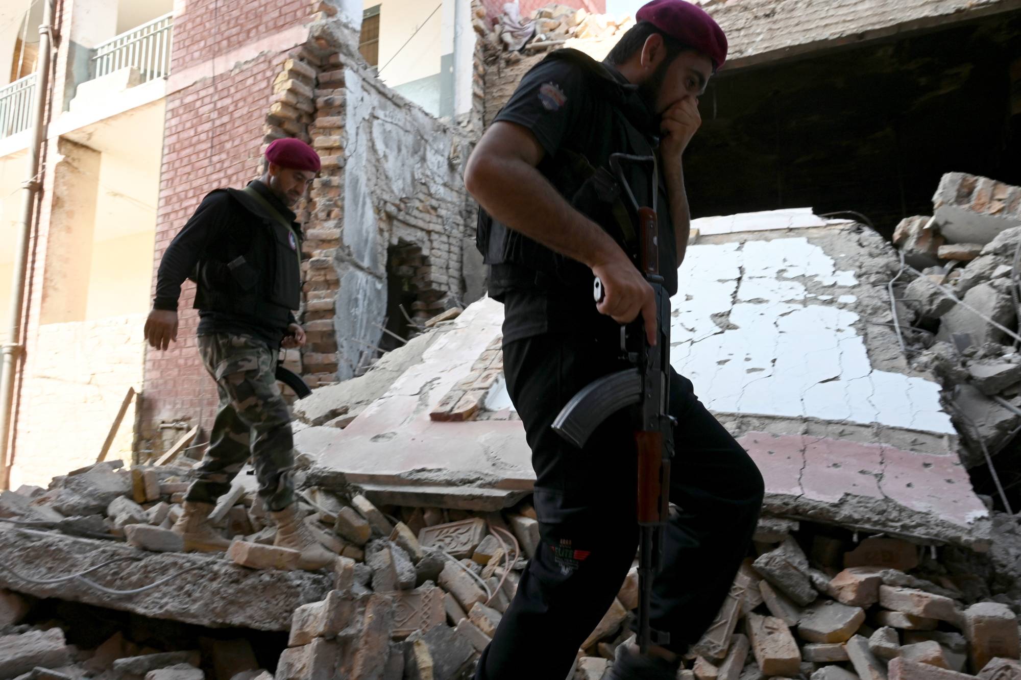 وقال مسؤولون إن الأضرار والخسائر البشرية كانت سترتفع لو كان المهاجمان قد فجرا العبوات الناسفة حول سترتيهما داخل المبنى، بعد تمكنهما من الدخول. ودمر الانفجاران جزءاً من المبنى، وحوصر كثيرون تحت الأنقاض، طبقاً لما ذكره مسؤولون، مشيرين إلى أن رجال الشرطة الذين قتلوا والجرحى كانوا محاصرين داخل الأنقاض. ولم تعلن أي جماعة المسؤولية عن الهجوم ، غير أنه من المعروف أن حركة «طالبان» الباكستانية تشن هجمات في البلاد. وقتلت حركة «طالبان باكستان»، التي تحمل نفس اسم نظيرتها الأفغانية، لكنها حركة مختلفة، حوالي 80 ألف شخص خلال عقود من أعمال العنف. وأوضح مفتش عام شرطة إقليم «خيبر بختونخواه»، أختر حياة، أن انتحاريين حاولا اقتحام مجمع يضم مركزاً للشرطة ومباني حكومية في منطقة «خيبر»، وتم القضاء على الانتحاري الذي حاول اقتحام المجمع من الباب الخلفي. أما الانتحاري الآخر الذي حاول الدخول من المدخل الرئيسي للمجمع فقد تبادل إطلاق النار مع رجال الأمن، وفجر نفسه بالقرب منهم، ما أدى إلى مقتل 4 من رجال الشرطة وإصابة 8 بجروح. وأضاف أن قوات الأمن قامت بجمع الأدلة من الموقع، وتم نقل أشلاء الانتحاريين إلى مختبر الطب الجنائي لتحديد هويتيهما. من جانبه، أدان رئيس الوزراء الباكستاني شهباز شريف الهجوم، معرباً عن تعازيه في رجال الأمن الذين فقدوا أرواحهم أثناء التصدي للانتحاريين. وجاء هذا الهجوم بعد يومين من هجوم انتحاري استهدف دورية للقوات الخاصة في مدينة بيشاور، عاصمة الإقليم، أدى إلى مقتل اثنين من رجال الأمن وإصابة 7 آخرين، وأعلنت «حركة الجهاد» الباكستانية، حديثة النشأة، مسؤوليتها عن الهجوم.
