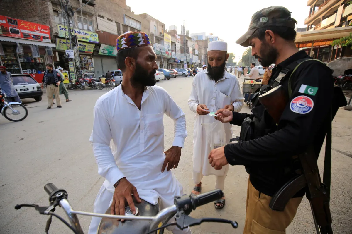شرطي باكستاني يتفقد هويات المواطنين عند نقطة تفتيش (إ.ب.أ)