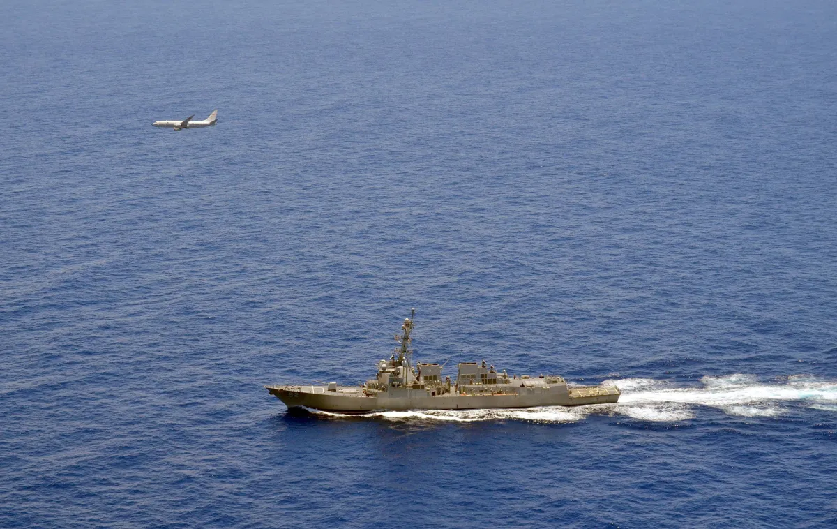 أرشيفية لطائرة حربية أميركية تحلق فوق المدمرة «مومسن» المزودة صواريخ خلال مهمة أميركية في بحر الصين الجنوبي (رويترز)