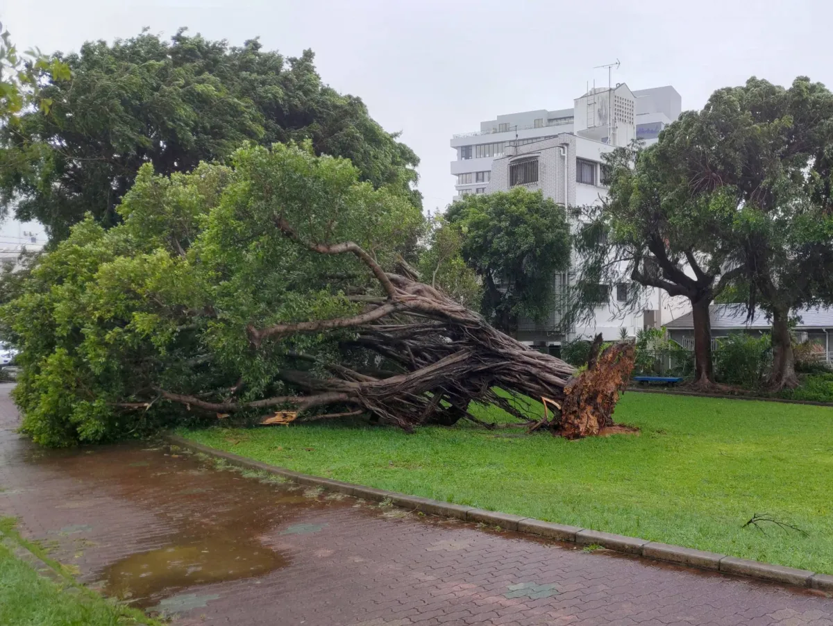 شجرة اقتُلعت من جذورها بسبب الرياح العاتية التي سببها إعصار «خانون» بحقل في ناها بمحافظة أوكيناوا اليابانية (إ.ب.أ)