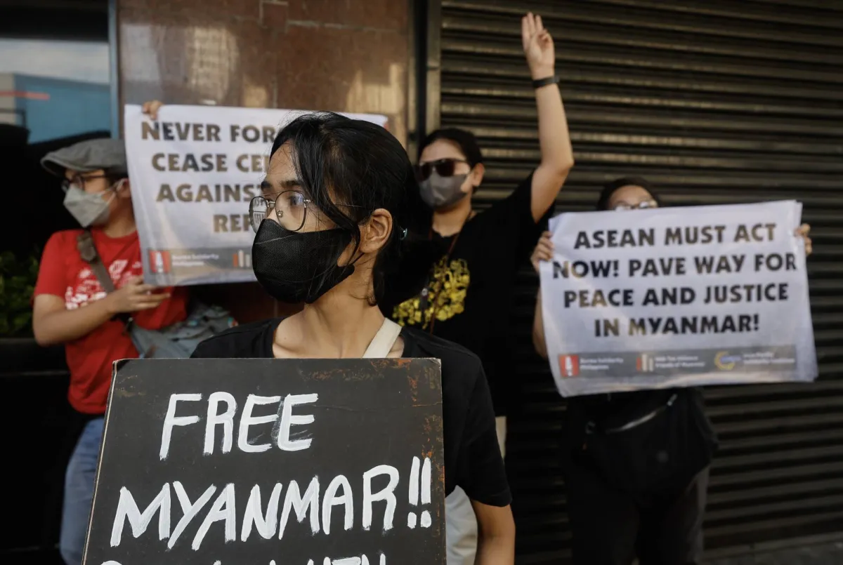 ناشطون يحملون لافتات مع رسائل تضامن مع ذكرى انتفاضة 8888 الطلابية في ميانمار خلال تجمع خارج سفارة ميانمار في مانيلا بالفلبين 8 أغسطس 2023 (إ.ب.أ)