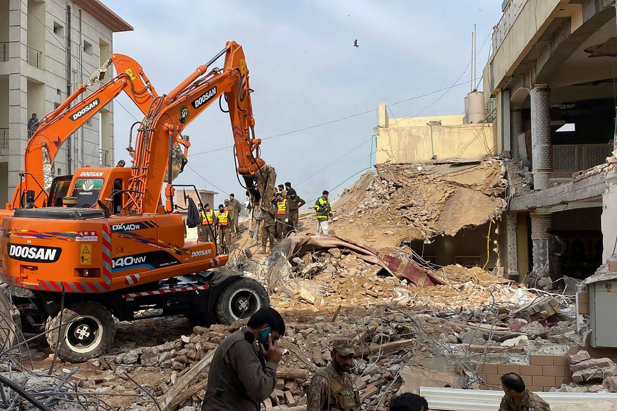 السلطات الباكستانية تستخدم الآلات الثقيلة لإزالة الأنقاض والبحث عن الضحايا في اليوم التالي لتفجير مسجد الشرطة في بيشاور في 31 يناير 2023 (أ.ف.ب)