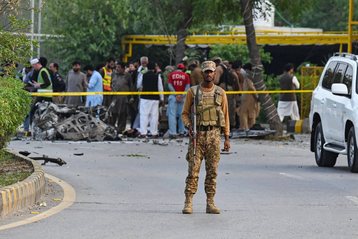 أحد أفراد الأمن يقف في حراسة موقع تفجير إرهابي في بيشاور في 18 يوليو 2023 (أ.ف.ب)