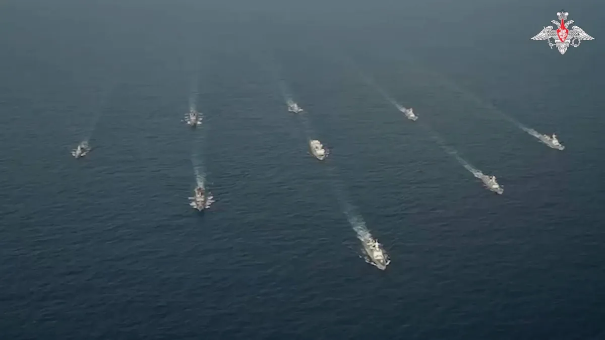 صورة مقتبسة من فيديو نشرته وزارة الدفاع الروسية للسفن الحربية الروسية والصينية خلال التدريبات البحرية في بحر الصين الشرقي والدوريات المشتركة بالمحيط الهادي (رويترز)