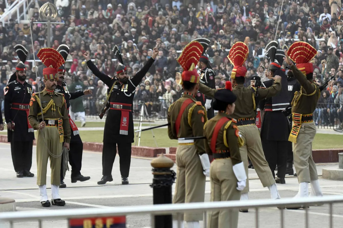 صورة ملتقطة في 26 ديسمبر 2019 يشارك فيها أفراد من قوات أمن الحدود الهندية (يرتدون ملابس بنية) وحراس باكستانيون (يرتدون ملابس سوداء) في حفل على الحدود على مسافة نحو 35 كم من أمريتسار (أ.ف.ب)