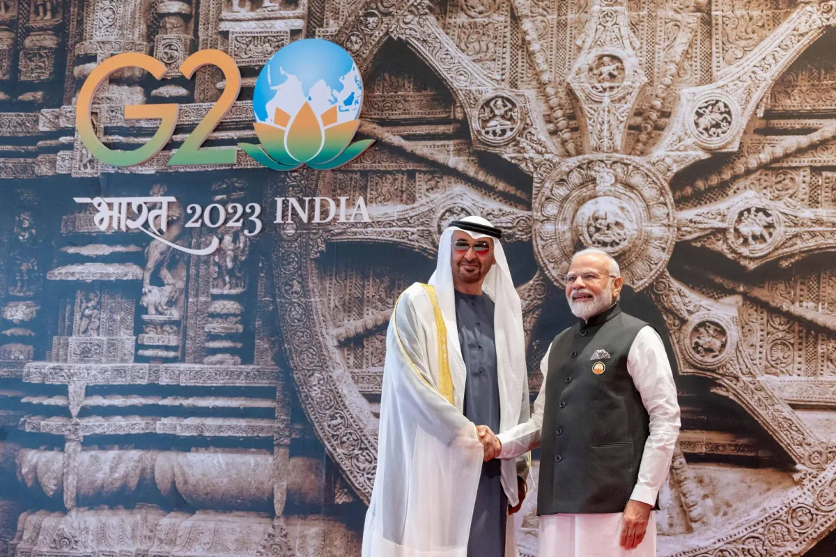 بحث الشيخ محمد بن زايد آل نهيان، رئيس دولة الإمارات، وناريندرا مودي رئيس وزراء الهند، مختلف جوانب «الشراكة الاستراتيجية الشاملة» و«الشراكة الاقتصادية الشاملة»، والفرص الواعدة لتعزيزهما بما يُسهم في استدامة التنمية والازدهار لشعبي البلدين، وذلك في إطار الزيارة التي يقوم بها رئيس الإمارات للمشاركة في قمة مجموعة العشرين التي انطلقت في نيودلهي السبت وتستمر يومين.