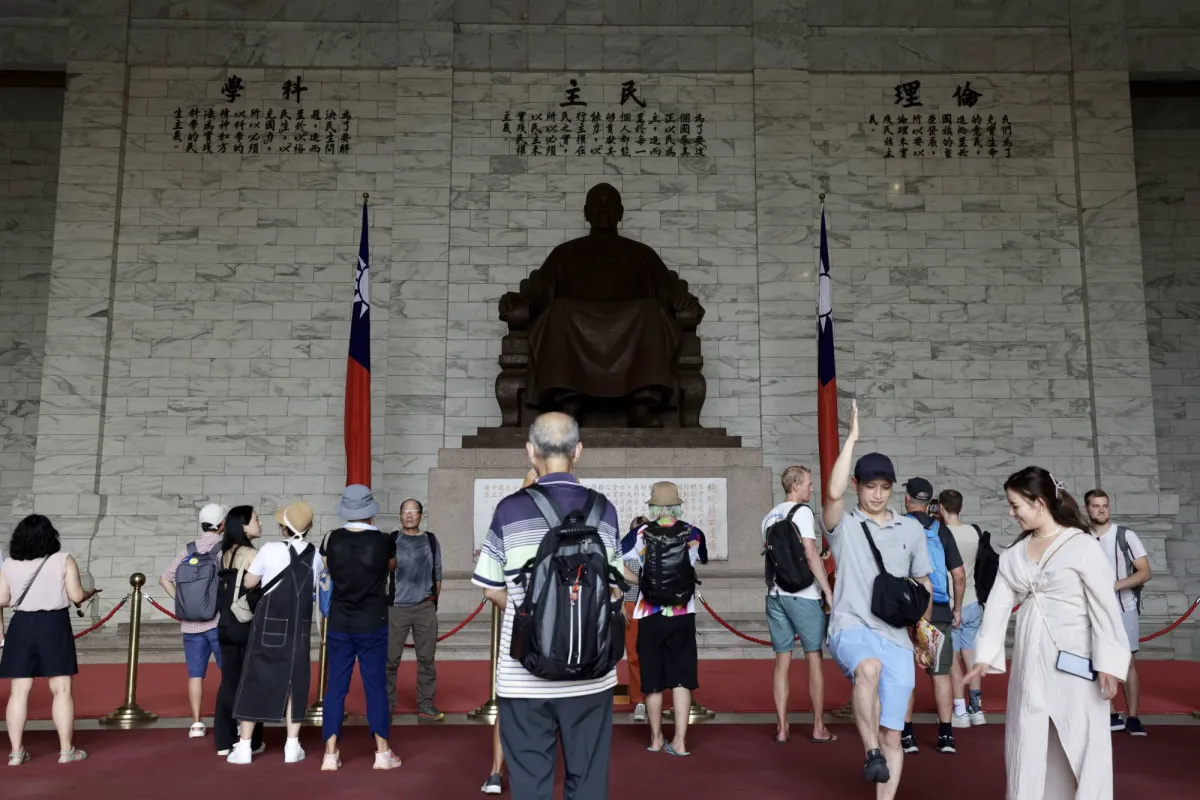 أشخاص يزورون النصب التذكاري للشخصية التاريخية شيانغ كاي-شيك في تايبيه الاثنين (إ.ب.أ)