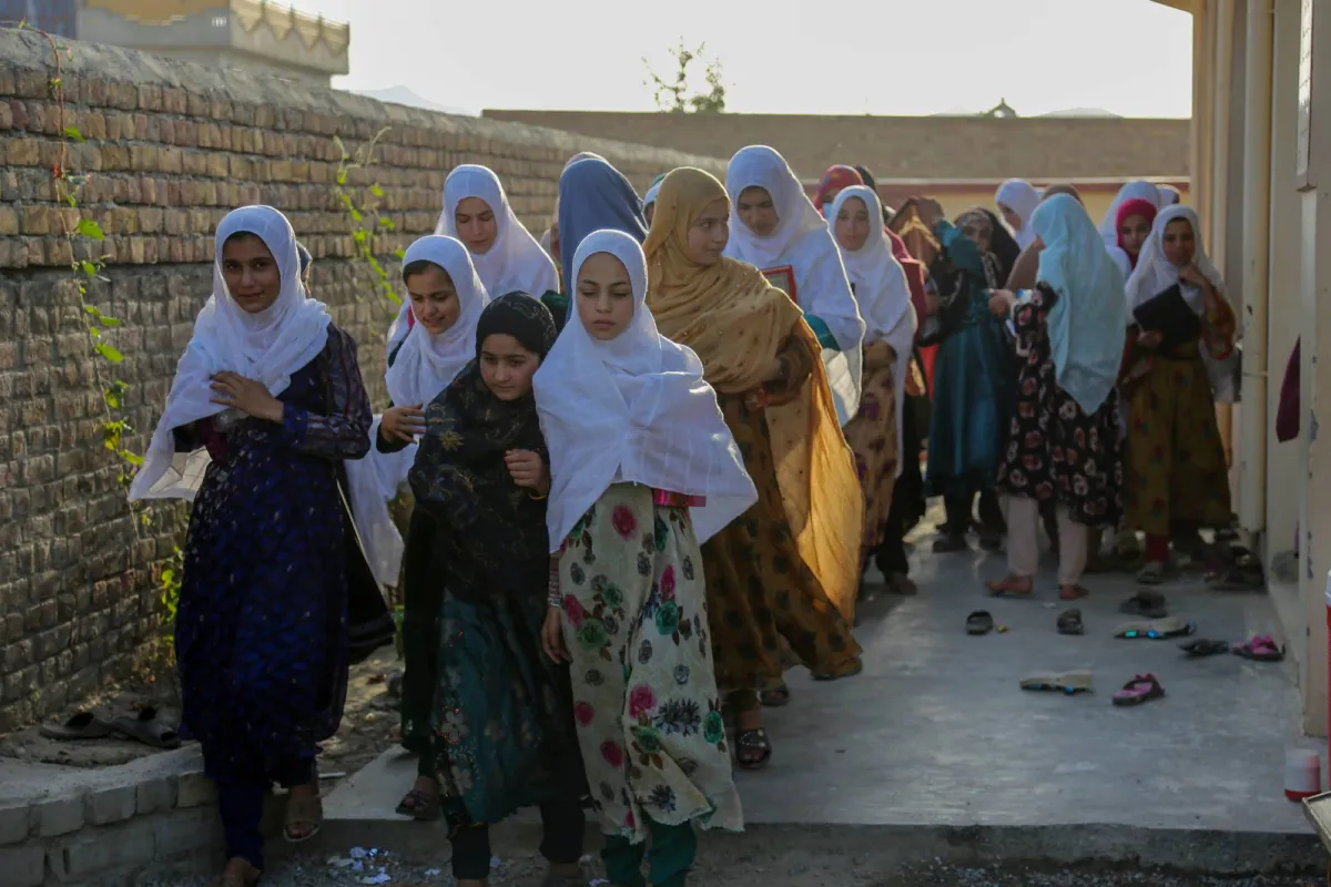 فتيات أفغانيات يغادرن بعد حضور دروس في مدرسة دينية إسلامية في كابل (إ.ب.أ)