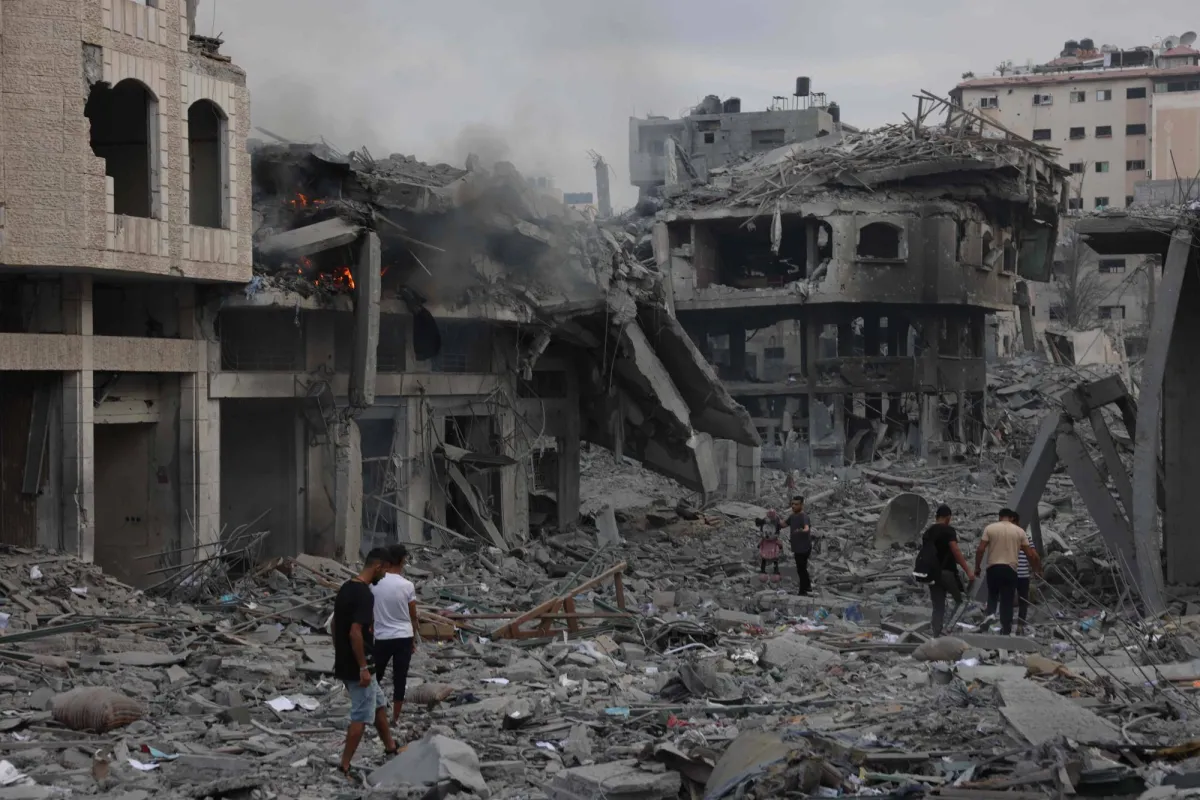 فلسطينيون يسيرون بين الأنقاض وسط الدمار الذي خلفته الغارات الجوية الإسرائيلية على غزة (أ.ف.ب)