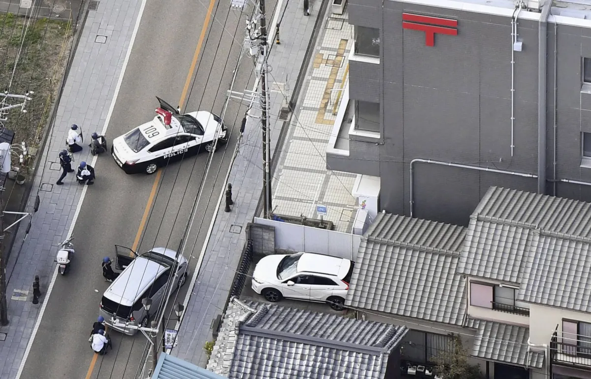 المستجيبون الأوائل يتخذون موقعهم خارج مكتب البريد حيث يُعتقد أن رجلاً في مدينة وارابي بمحافظة سايتاما شمال طوكيو يحتجز رهائن (أ.ب)