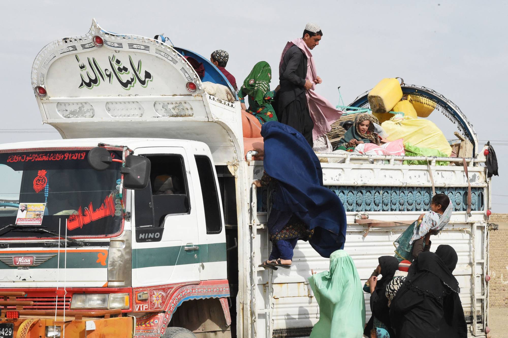 لاجئون أفغان يتسلقون شاحنة لعبور الحدود الباكستانية الأفغانية في شامان في 7 نوفمبر 2023 بعد قرار الحكومة الباكستانية طرد الأشخاص المقيمين بشكل غير قانوني في البلاد (أ.ف.ب)