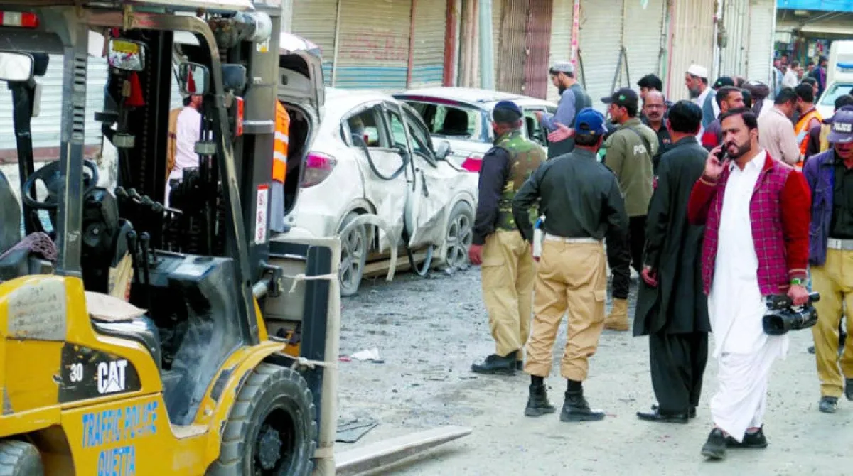 مسؤولو الأمن الباكستانيون يتفقدون موقع انفجار في كويتا عاصمة مقاطعة بلوشستان (إ.ب.أ)