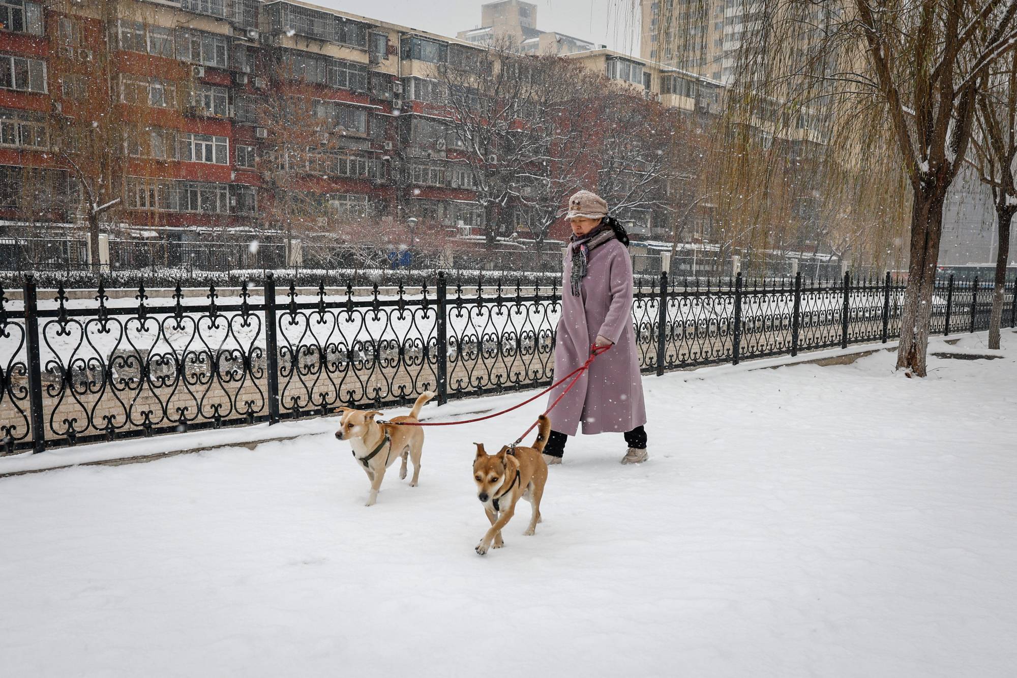 امرأة تمشي مع كلابها خلال تساقط الثلوج في بكين (إ.ب.أ)