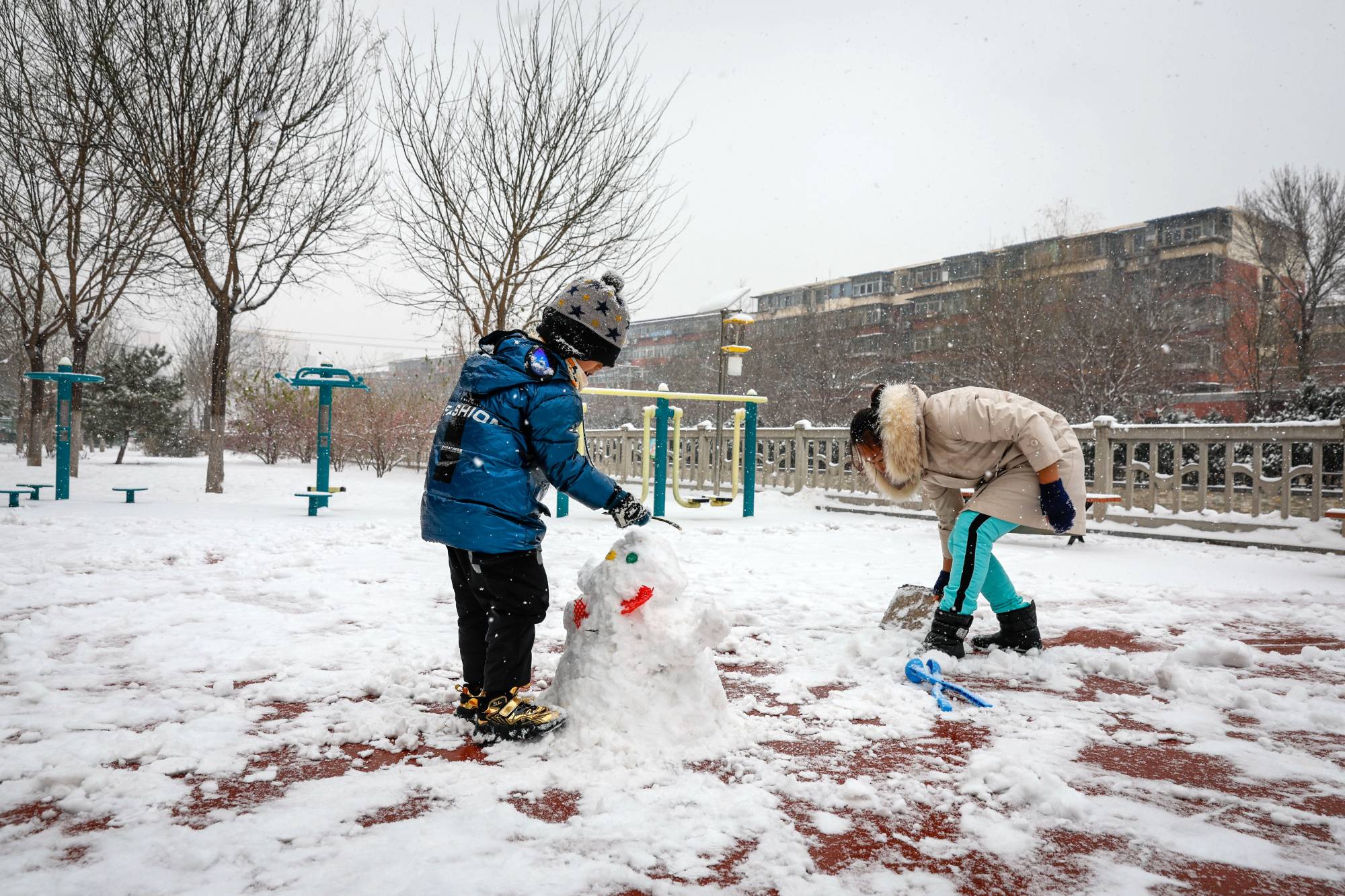 طفل يصنع رجلاً من الثلج في بكين (إ.ب.أ)