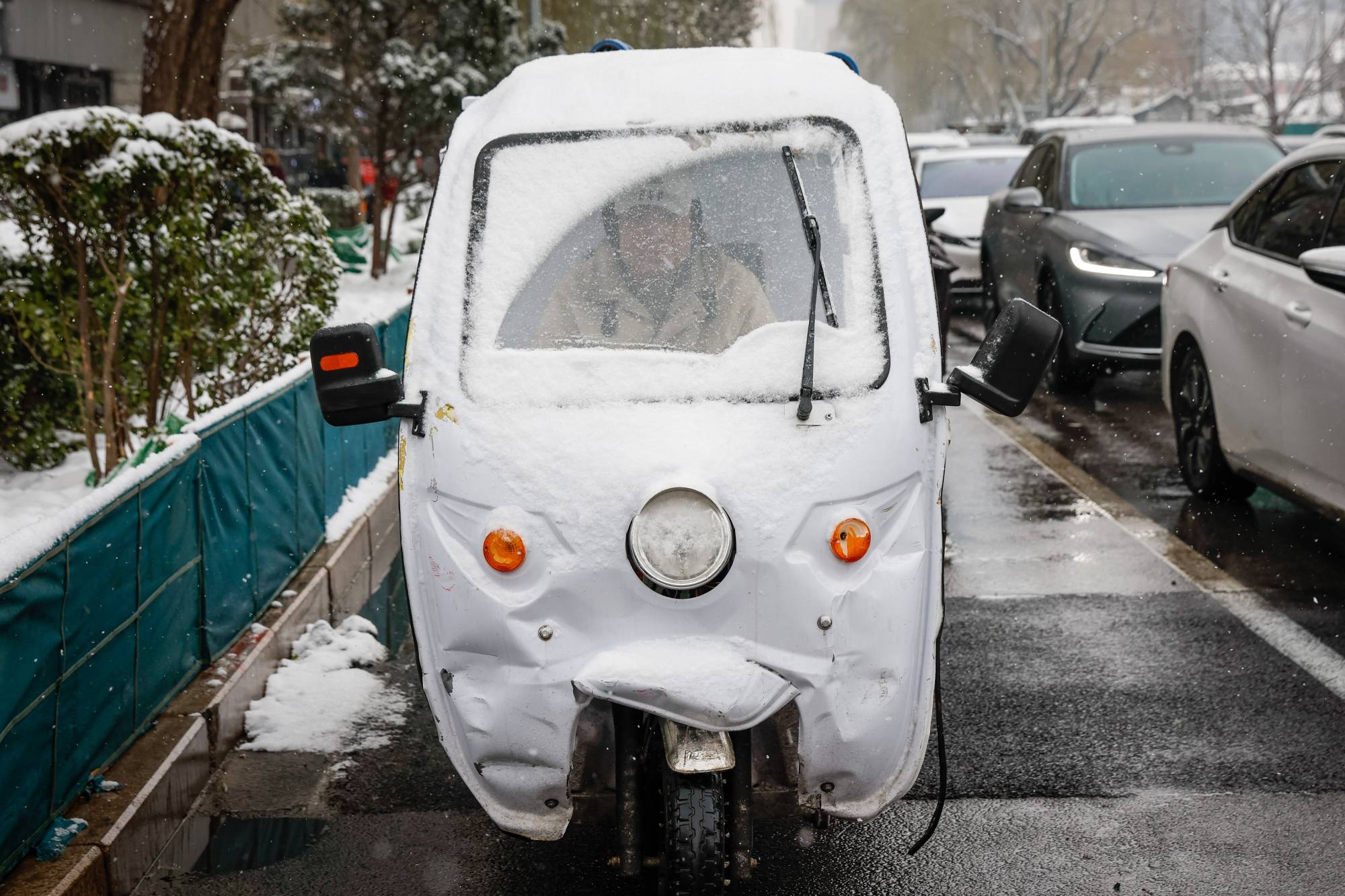رجل يركب عربة كهربائية مغطاة بالثلوج في العاصمة الصينية (إ.ب.أ)
