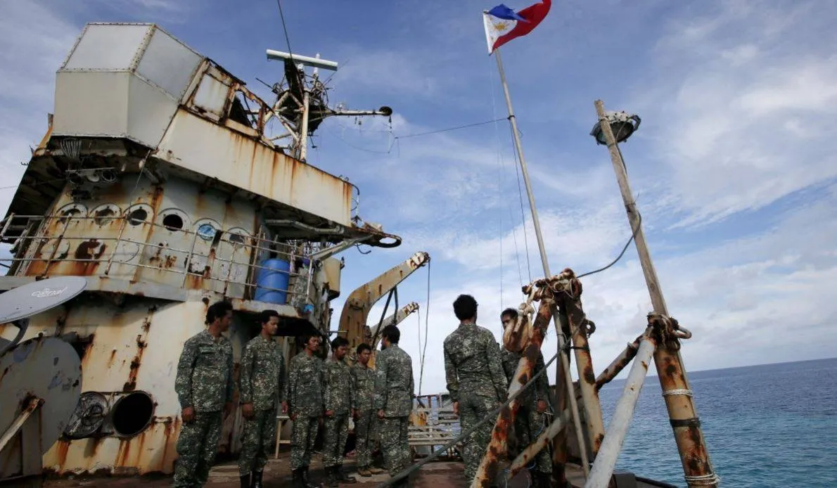 مشاة البحرية الفلبينية أعلى سييرا مادري وهي سفينة بحرية متهالكة جنحت منذ عام 1999 وأصبحت مفرزة عسكرية في توماس شول الثانية المتنازع عليها في بحر الصين الجنوبي (رويترز)