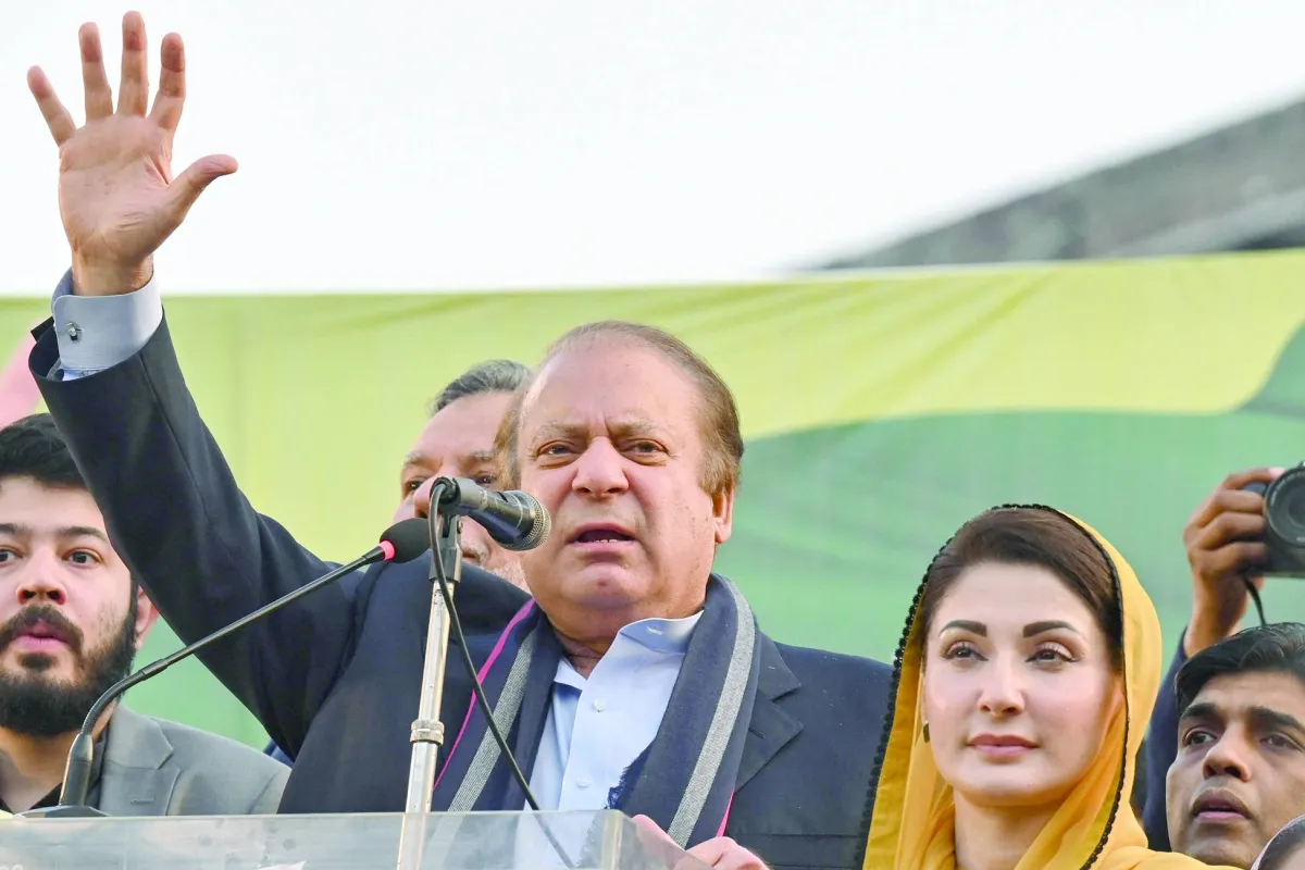 رئيس الوزراء السابق نواز شريف يتحدث لأنصاره وإلى جانبه ابنته مريم في لاهور الاثنين (أ.ف.ب)