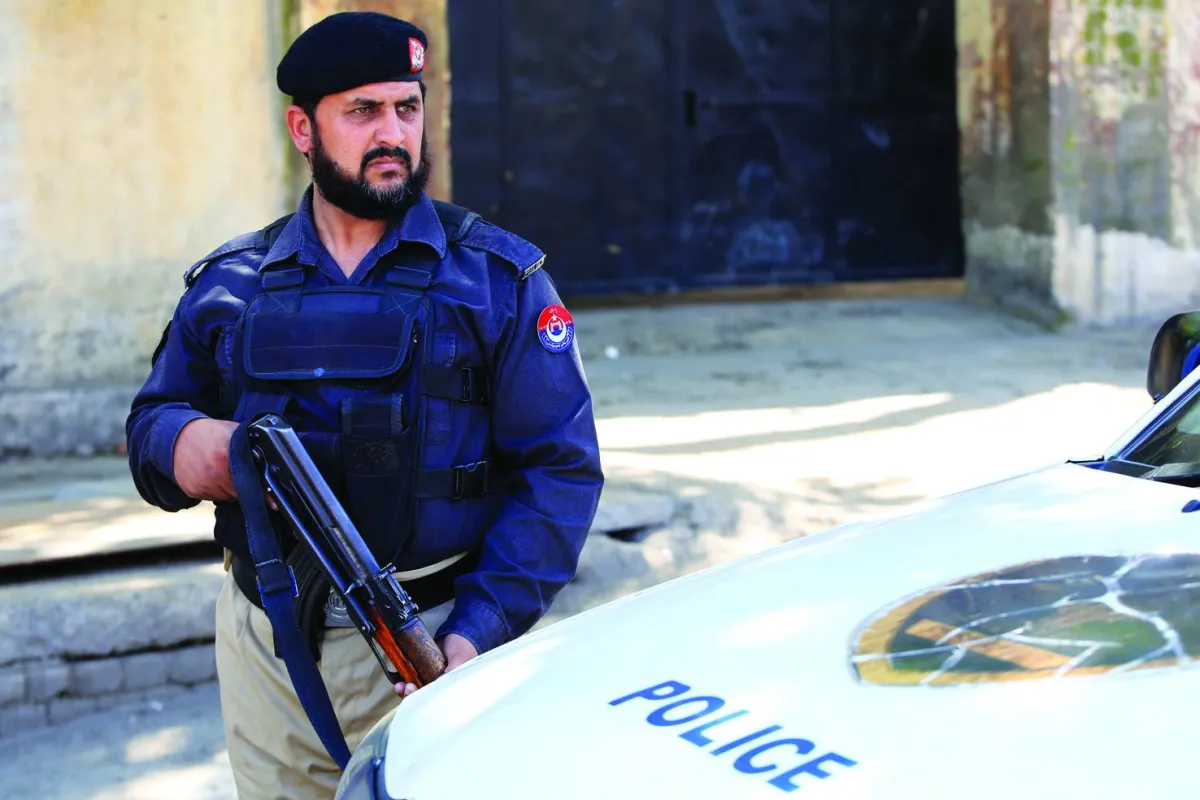 مسؤول أمني باكستاني يقف حارساً عند نقطة تفتيش في بيشاور عاصمة مقاطعة خيبر بخوا بباكستان في 18 مارس 2024 وقالت حكومة «طالبان» إن طائرات مقاتلة باكستانية قصفت قرى أفغانية عدة (إ.ب.أ)
