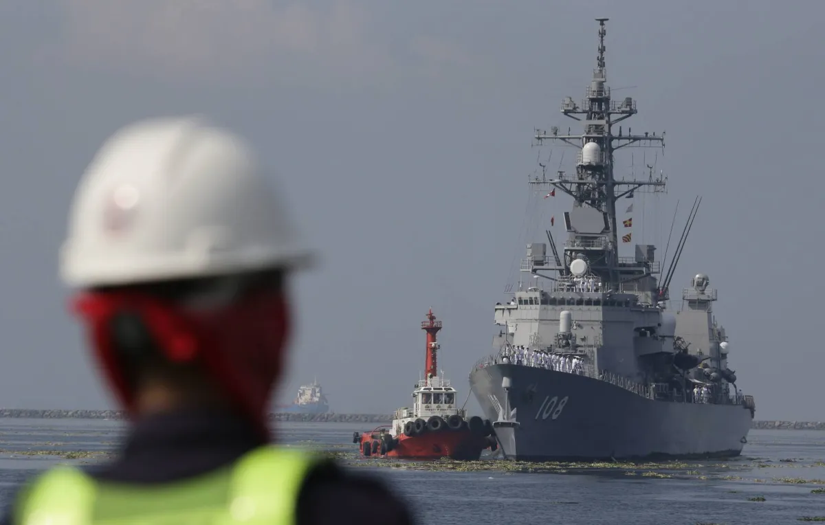 عامل ميناء فلبيني ينظر إلى مدمرة يابانية تستعد للرسو في الميناء الجنوبي لمانيلا للمشاركة في المناورة البحرية المشتركة (أ.ب)