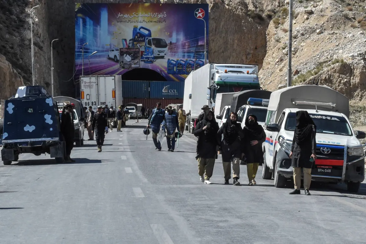 أفراد الأمن خارج نفق لاكباس حيث قامت السلطات الباكستانية بإغلاق المدخل باستخدام حاويات الشحن أثناء اعتصام حزب بلوشستان الوطني منغال (BNP-M) للمطالبة بالإفراج عن نشطاء بارزين اعتُقلوا بتهمة الإرهاب والفتنة والقتل على مشارف كويتا (أ.ف.ب)