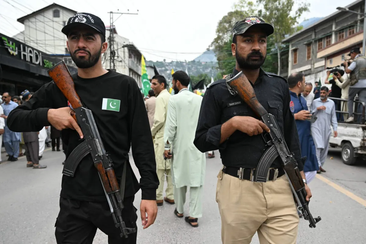 رافقت شرطة كشمير ناشطين وأنصار مؤتمر الحريات لجميع الأحزاب خلال احتجاج مناهض للهند في مظفر آباد في 2 مايو 2025 عقب استمرار التوترات الحدودية بين باكستان والهند على خلفية هجوم كشمير (أ.ف.ب)