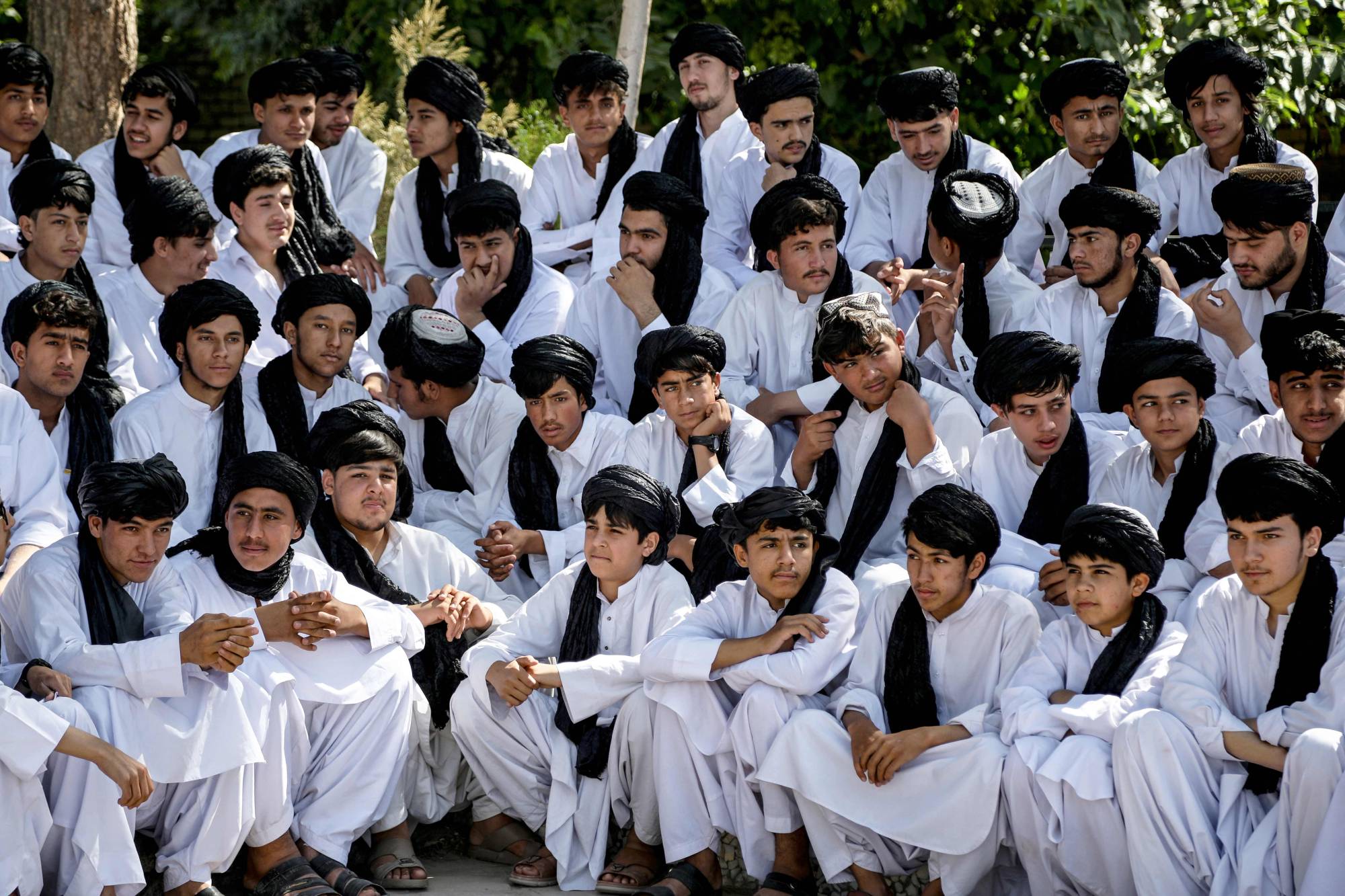لقطة لطلاب مدرسة أفغانية يرتدون الزي الجديد الذي فرضته حركة «طالبان» الذي يتكون من عمائم وسترات طويلة يتجمعون لحضور حدث بمدرسة في هرات 4 مايو 2025 (أ.ف.ب)
