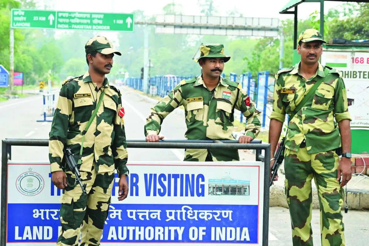 حراس حدود هنود قرب معبر واغا الحدودي مع باكستان أمس (أ.ف.ب)