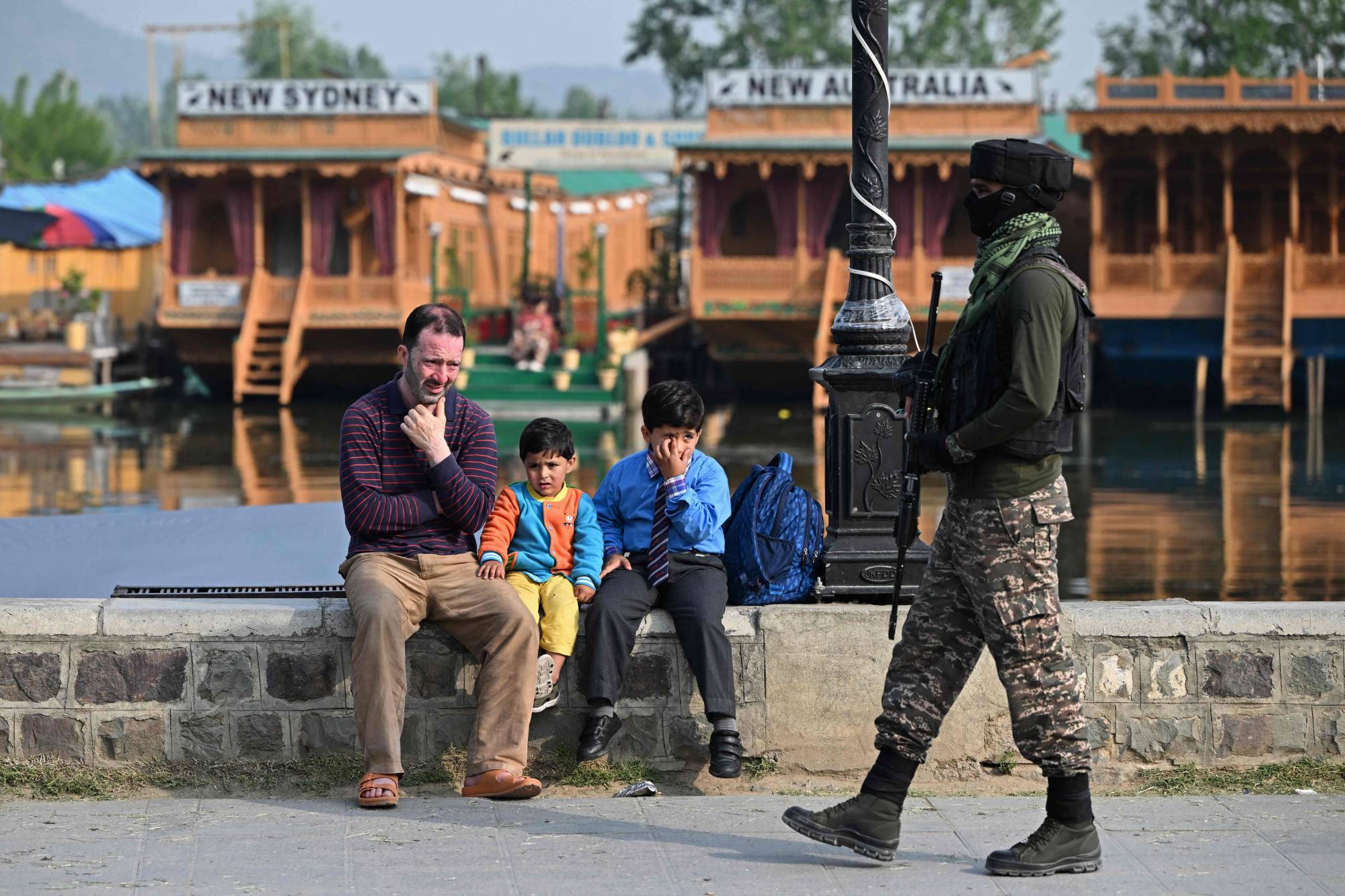 عائلة كشميرية تجلس على ضفاف بحيرة دال بينما يقوم أفراد من القوات شبه العسكرية الهندية بدورية في سريناغار (أ.ف.ب)