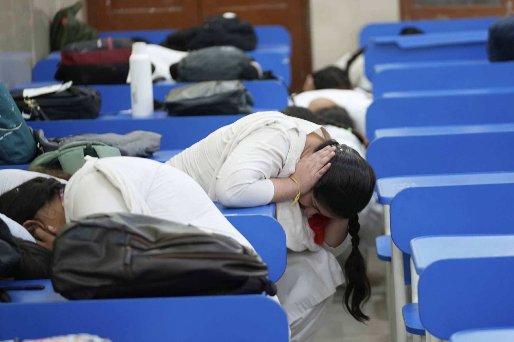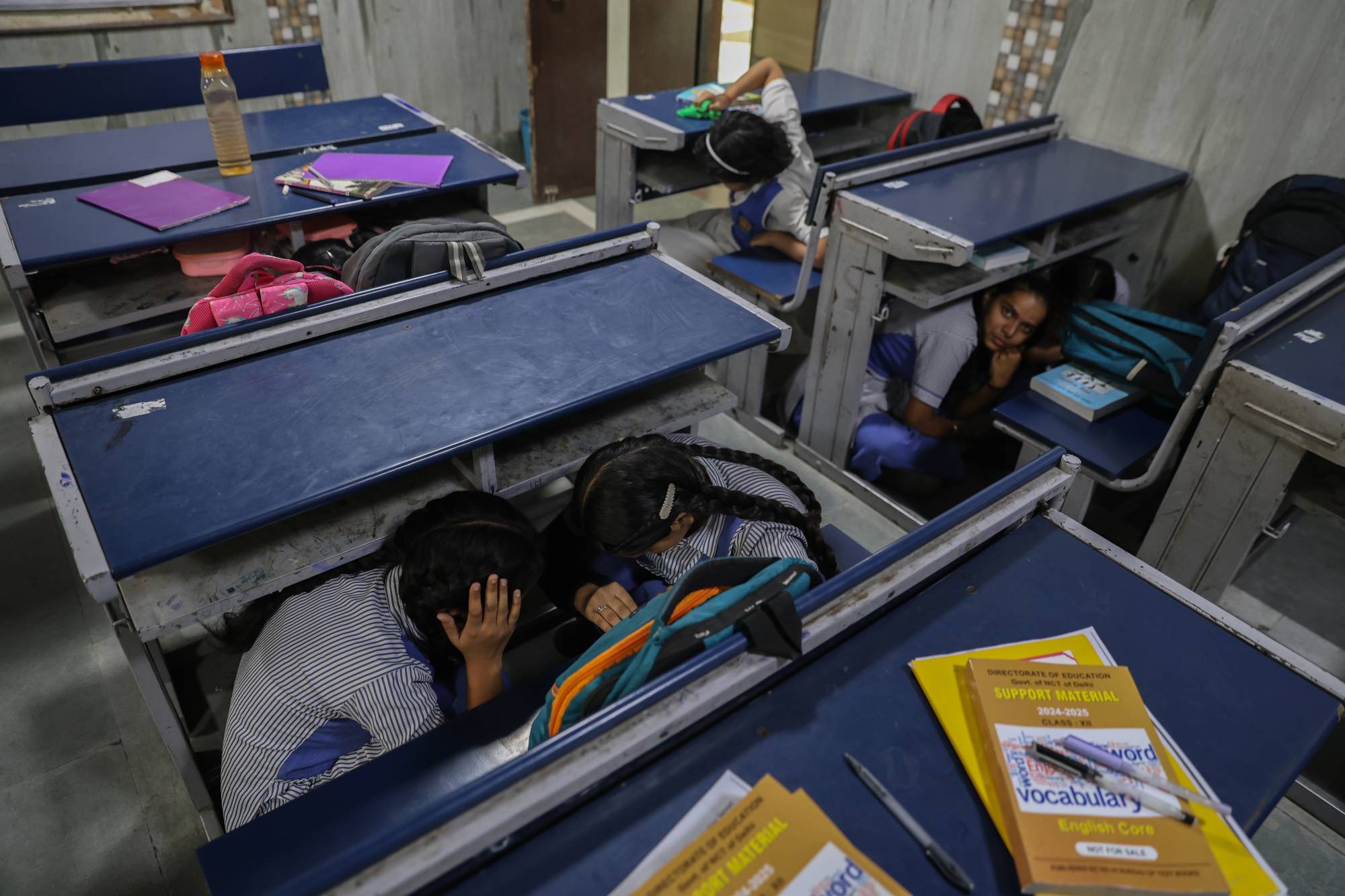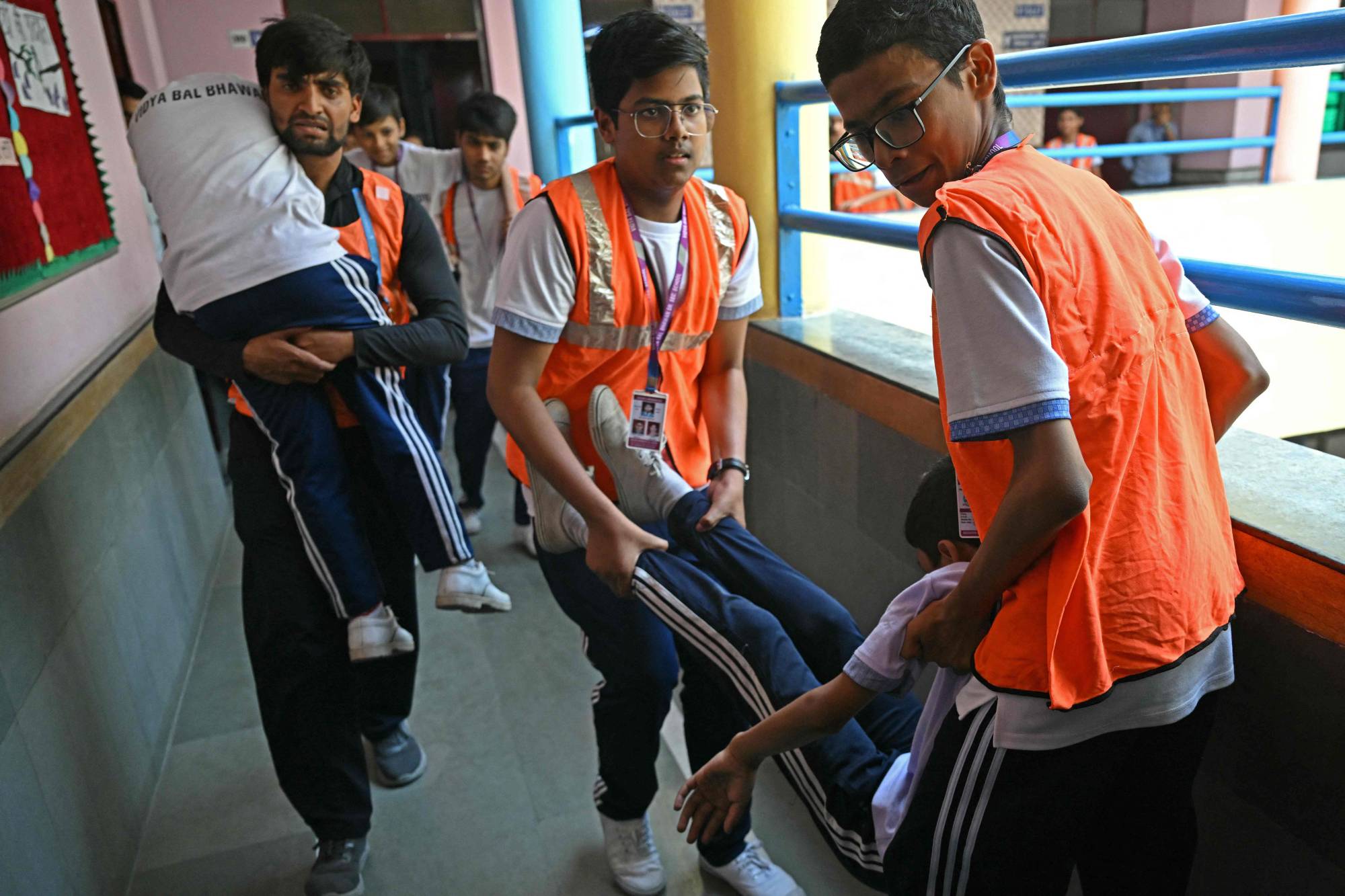 يشارك الطلاب في تدريب على الطوارئ ضمن تدريب وهميّ وطنيّ للدفاع المدني بمدرسة بنيودلهي (أ.ف.ب)
