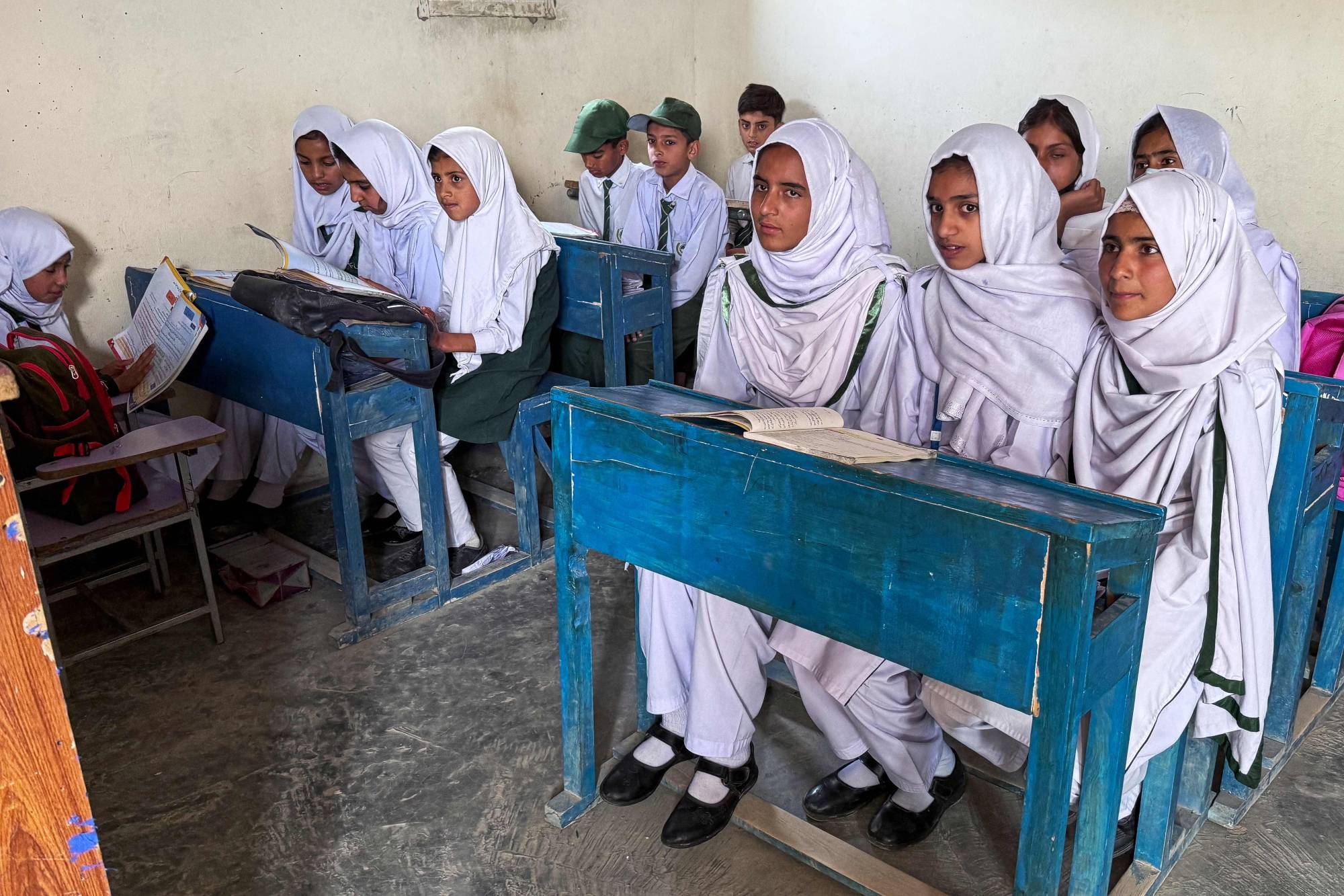 طلاب يحضرون فصلاً دراسياً في مدرسة عليكرة بمظفر آباد عاصمة كشمير الخاضعة للإدارة الباكستانية 5 مايو 2025 (أ.ف.ب)