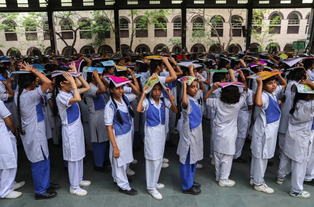 طلاب مدارس هنود في تدريب تجريبي براجكيا سارفودايا فيديالايا بنيودلهي (إ.ب.أ)