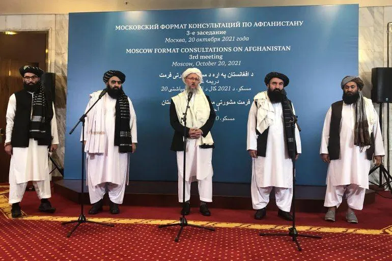وفد «طالبان» خلال المحادثات الأفغانية بموسكو في 2021 (رويترز)