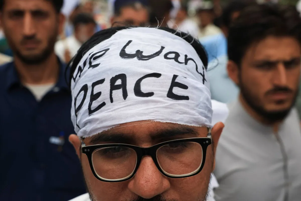 رجل يضع عصابة رأس في حين يشارك مع أشخاص آخرين من باكستان والمناطق القبلية الحدودية في أفغانستان في مظاهرة للاحتجاج على عنف المتشددين والمطالبة باستعادة السلام في كراتشي في 13 يوليو 2025 (رويترز)