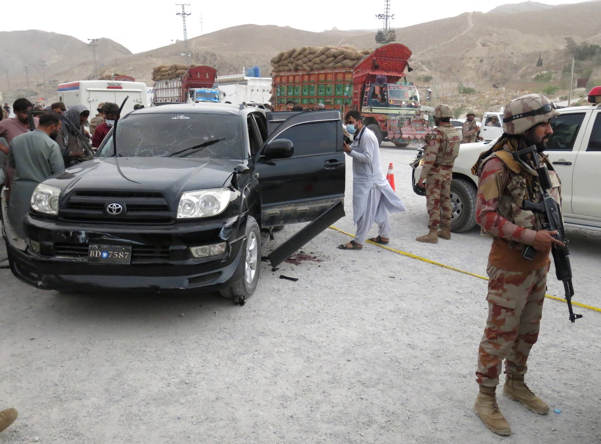 رجال أمن باكستانيون في موقع انفجار عبوة ناسفة بدائية الصنع في كويتا عاصمة إقليم بلوشستان المضطرب في 19 يوليو 2025 وقد أسفر انفجار العبوة الناسفة عن مقتل الرائد أنور كاكار في كويتا (إ.ب.أ)