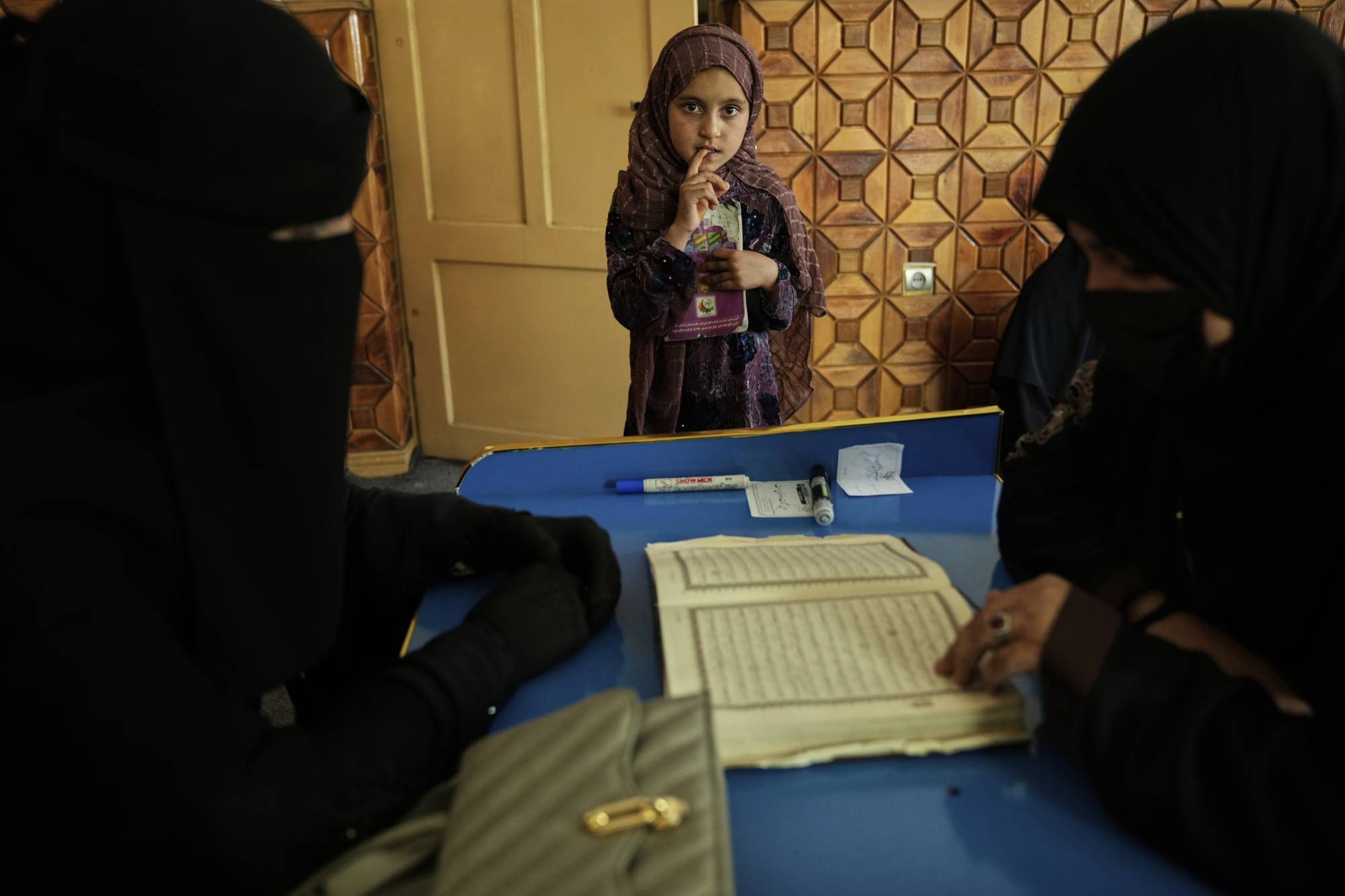 في غرفة تحت الأرض بمركز «تسنيم نصرت»، تحتمي الطالبات من حر الصيف، ويجلسن على أرضية مغطاة بالسجاد حول طاولات بلاستيكية صغيرة، يتتبعن بمداد أقلامهن آيات القرآن الكريم باللغة العربية. كانت الشابات العشر جميعهن يرتدين النقاب الأسود الذي يغطي الجسد بالكامل ولا يُظهر سوى العينين.